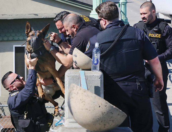 At one point he bolted near the Pajaro Middle School campus and then back into the agricultural fields. With the aid of a canine, police chased Rangel back towards the Pajaro River levee, where he jumped into the river and attempted to swim back into Watsonville.