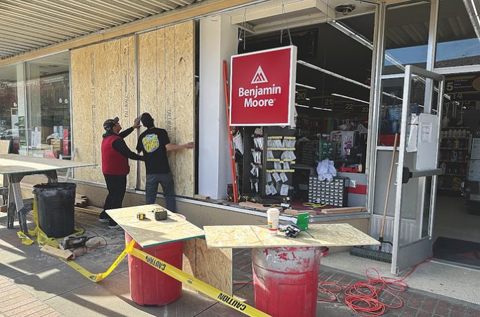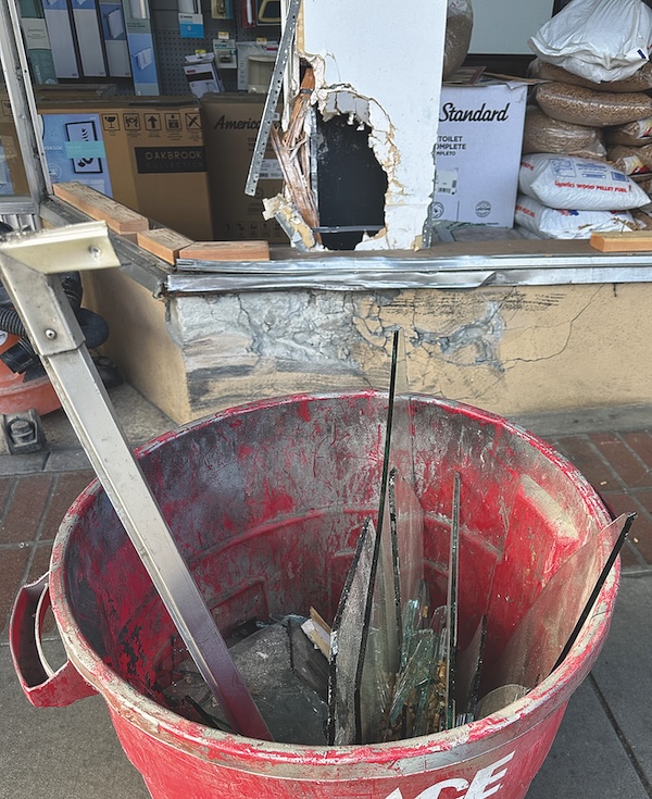 Six large window panes were shattered and the structure of Ace Hardware sustained major damage in the collision. (Tarmo Hannula/The Pajaronian)